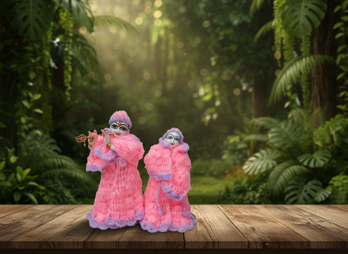 # 9 Inch Radha Krishna Woolen Dress Handcrafted woolen dress designed for 9-inch Radha Krishna idols, combining traditional devotional aesthetics with premium fabric quality. The dress features intricate detailing and vibrant colors that enhance the divine presence of your deity during puja and temple ceremonies. Soft, durable wool ensures longevity while maintaining the ornate appearance expected in devotional practice. Ideal for home altars, temple installations, and seasonal celebrations. A thoughtful addition to your spiritual collection that honors the sacred tradition of deity adornment.